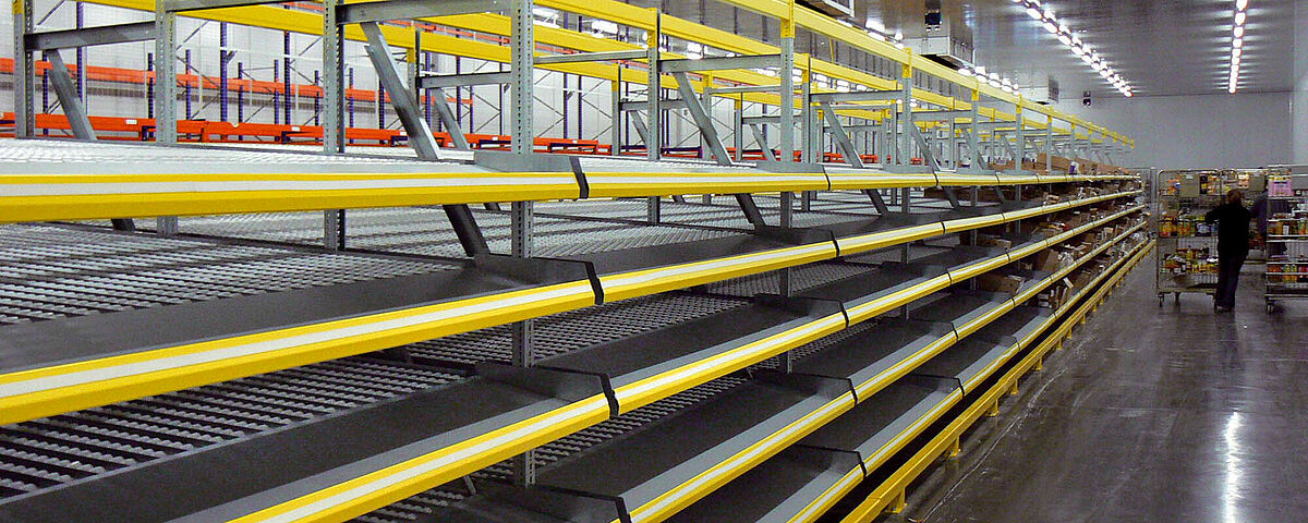 Pallet-doorloopstellingen zijn ruimtebesparende oplossingen die volgens de first-in-first-out principe werken en maken een hoog oppervlaktegebruik mogelijk door kanaalvorming. Doorloopstellingen voor orderverzamelen zijn bijzonder geschikt voor de voor rollenbanen gepaste kartonnen goederen of kratten en optimaliseren werkpaden en verzameltijden volgens het FIFO-principe.