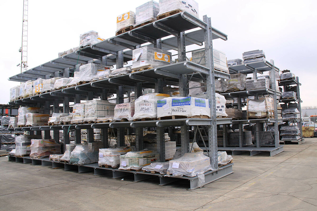 Daarom besloot het bedrijf de grondopslag te vervangen door een draagarmstellingsysteem van OHRA. De specialist voor draagarmstellingen uit Kerpen bij Keulen in Duitsland biedt speciaal een thermisch verzinkte variant van zijn stellingsysteem aan. De stellingen kunnen bovendien met een overkapping worden uitgerust - voor Celis ideaal voor de opslag van isolatiematerialen en hout. De handelaar in bouwmaterialen besloot bovendien de uitvoering voor zware belasting van de draagarmstelling met 1,2 meter lange draagarmen te gebruiken: de vier opslagniveaus van de 5 meter hoge stelling kunnen elk 1500 kilogram dragen. De draagarmstellingen zijn voor het grootste deel voorzien van verzinkte rasteroplegborden, zodat een doorlopend opslagoppervlak zonder storende steunen ontstaat. Daarmee kunnen alle waren zonder gewichts- of lengtebeperkingen op alle niveaus worden opgeslagen. Specialisten van OHRA hebben de totale planning, realisering en montage verzorgd.