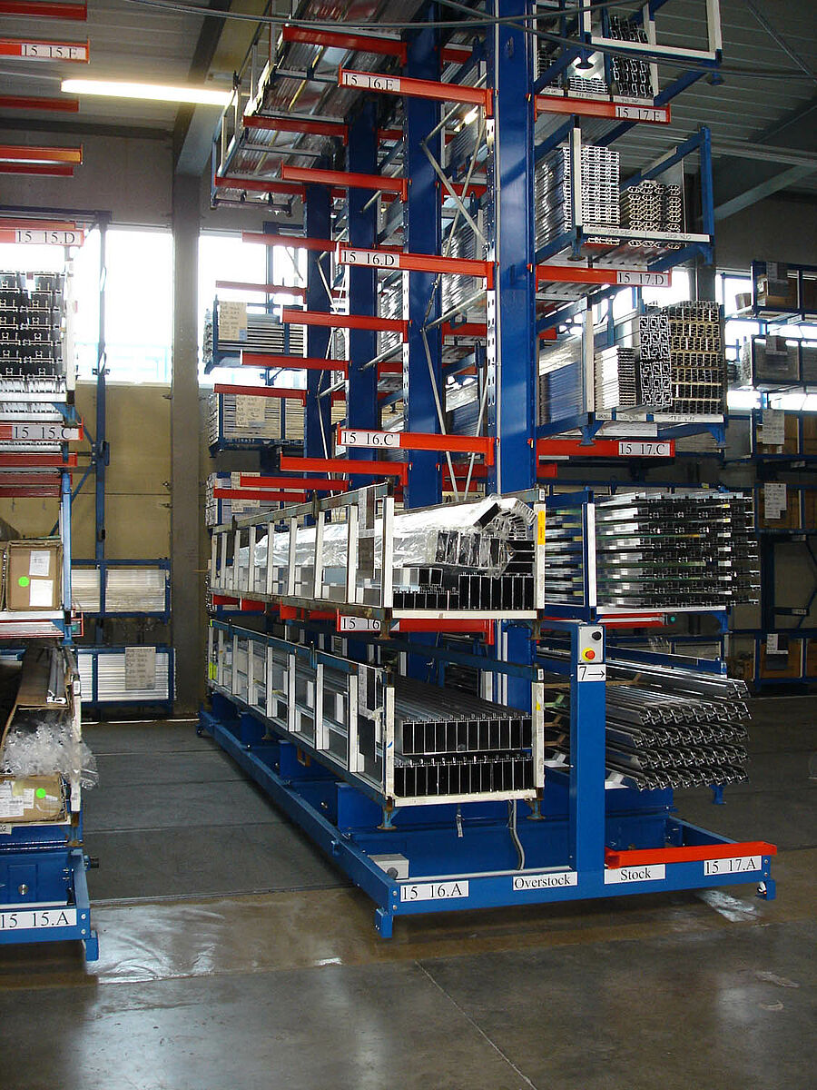 Voor de fabricage van de verschillende producten zet de klant aluminiumprofielen met meer dan 6 meter lengte in. Deze profielen worden in zogenaamde SCHUCO – aluminium - cassettes opgeslagen. Iedere cassette heeft een gewicht van ca. 1.600 kg. Deze worden d.m.v. een vorkheftruck met langs- en dwars rijrichting getransporteerd.