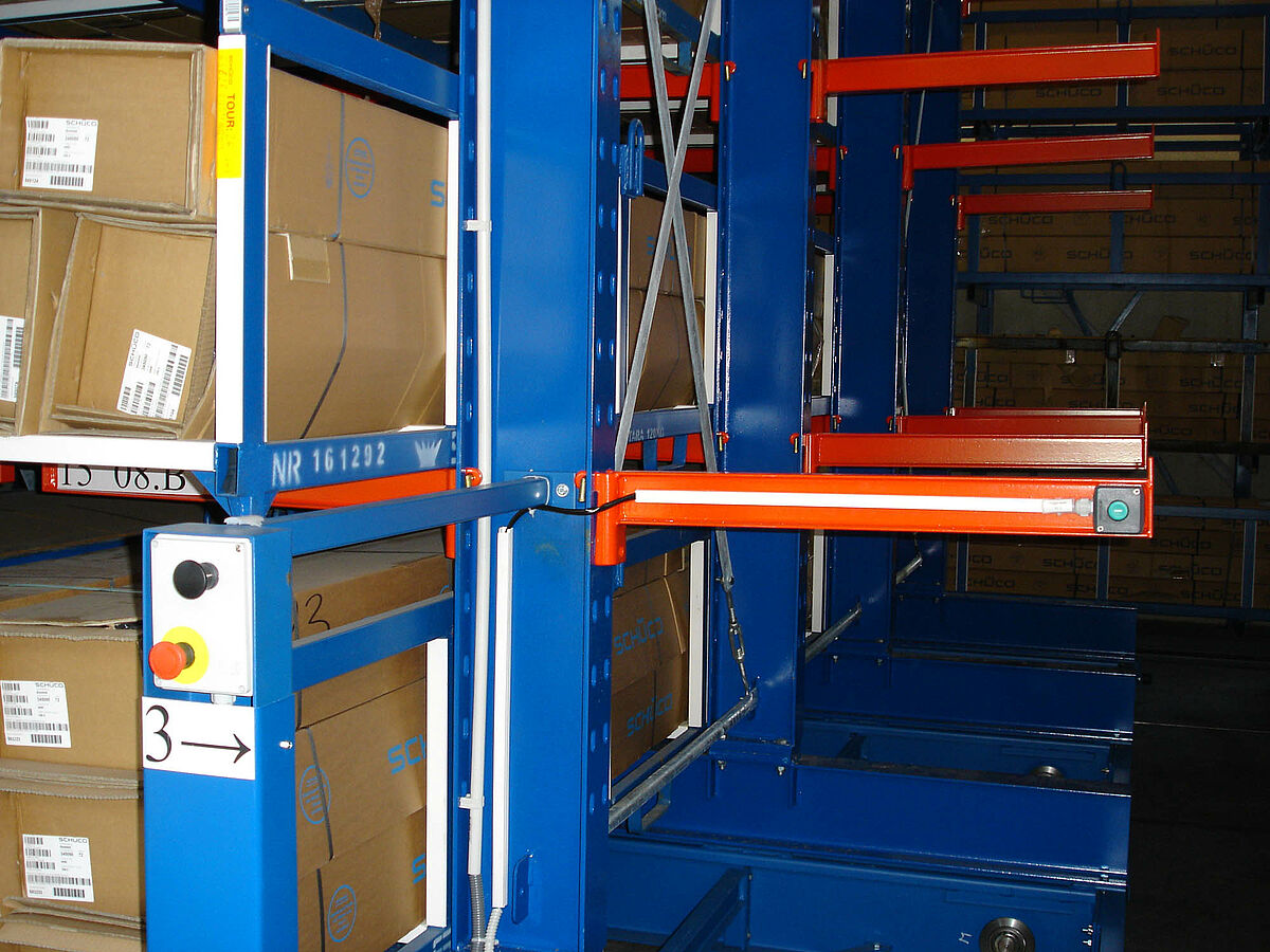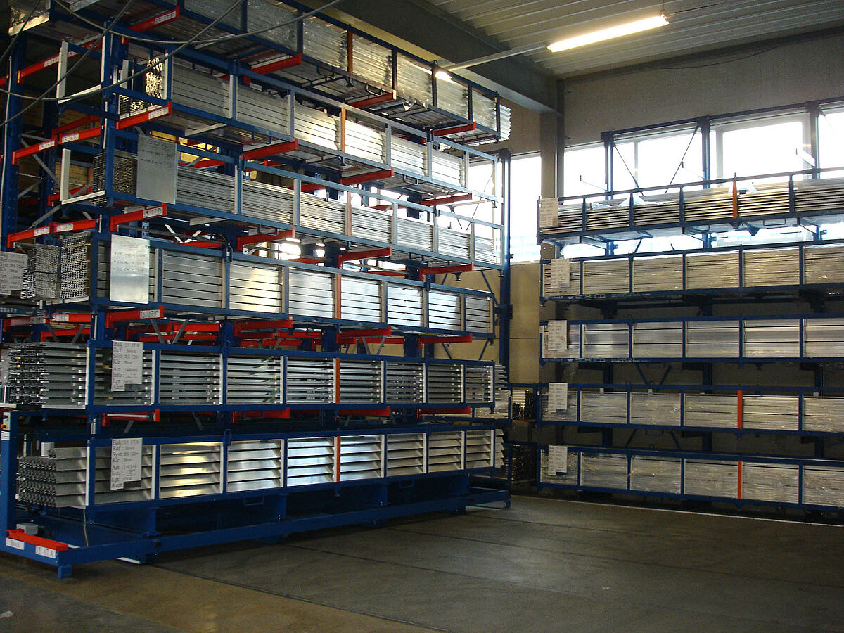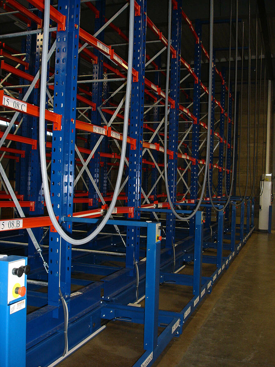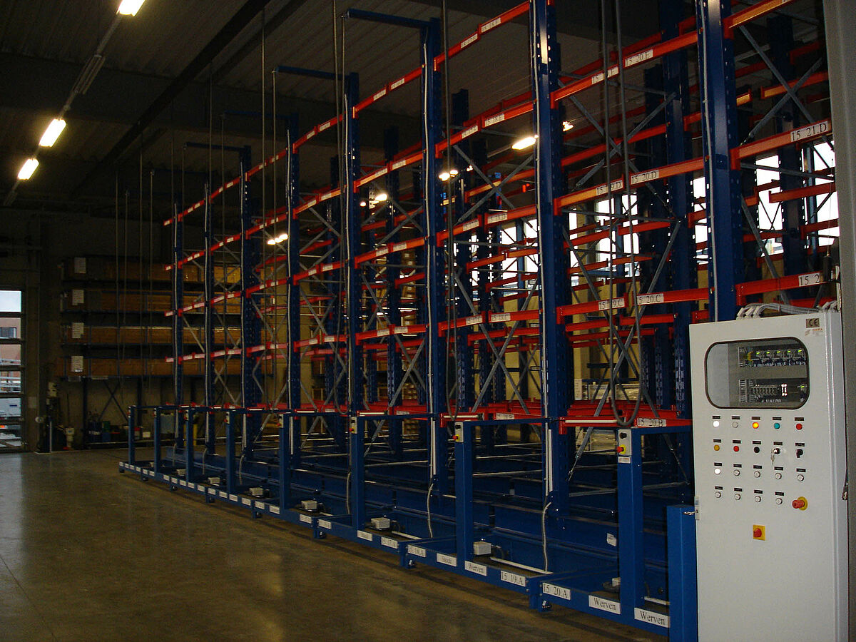 In de dialoog met de klant werkte men dan verschillende mogelijkheden uit voor de rationele opslag van de producten. De optimale oplossing waren draagarm stellingen op traverse wagens. Met dit opslagsysteem is het mogelijk, op zeer geringe grondoppervlakken een groot opslagvolume te verkrijgen. De enkele gangpaden tussen de afzonderlijke stelling rijen werden zó gepland, dat de zijdelings van de installatie staande wandstellingen frontaal bediend kunnen worden. Dit zou met statisch gemonteerde stellingen niet mogelijk gewezen zijn.