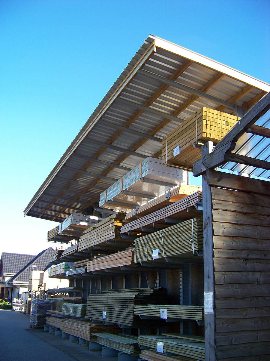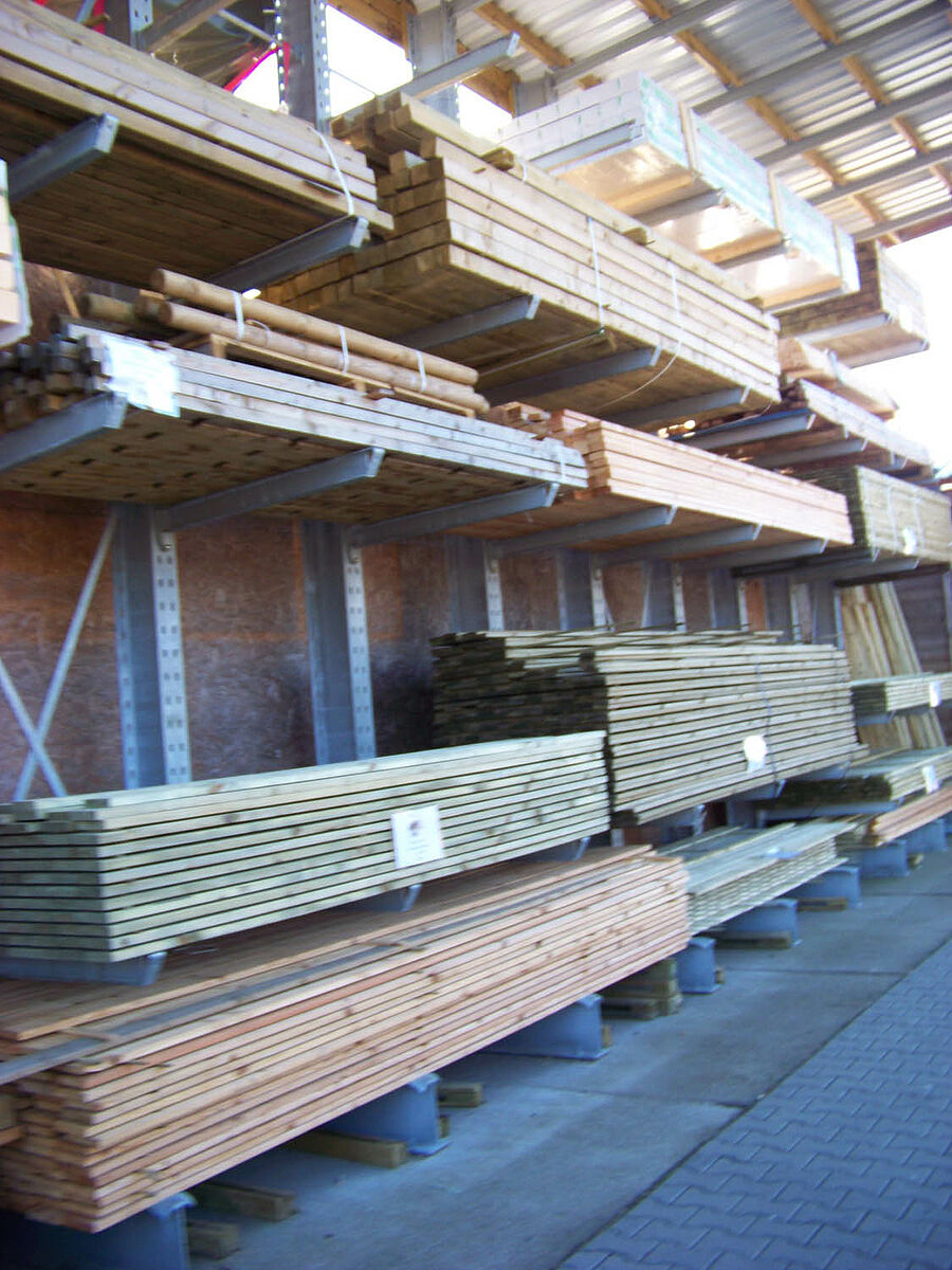 Het hout wordt in de open lucht opgeslagen: planken en constructiehout in tot 10 meter lange pakketten, andere goederen in stapels van kleiner formaat. Daarvoor gebruikt Dombal draagarmstellingen van de in Kerpen, Duitsland, gevestigde specialist in stellingsystemen OHRA. Vooral de stabiele constructie van de stellingstaanders uit warmgewalst staalprofiel overtuigde Dombal. De massieve IPE-staanders geven bij botsingen elastisch mee en behouden in vergelijking met plaatconstructies ook bij het ruwe magazijngebruik op de lange duur hun statische eigenschappen. Daarmee voldoet het stellingsysteem aan de hoogste eisen van veiligheid.