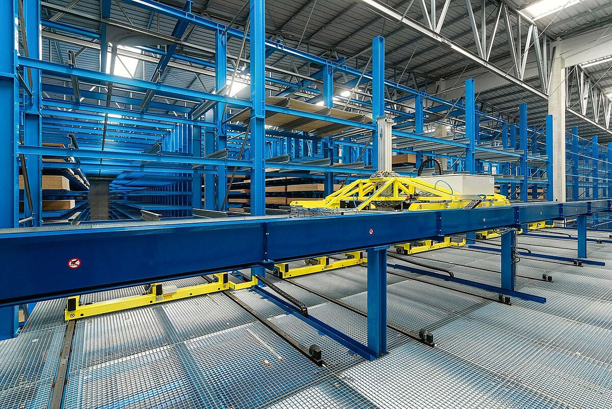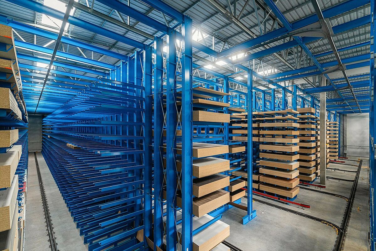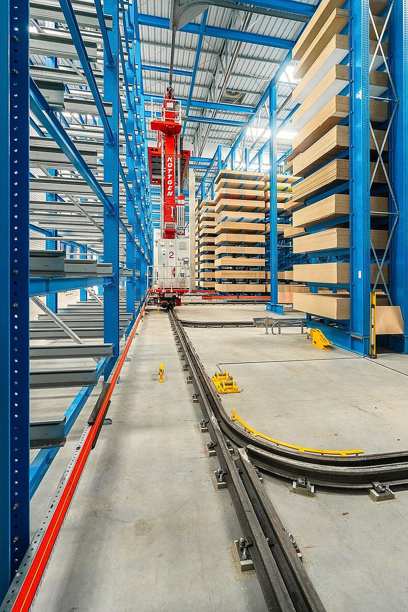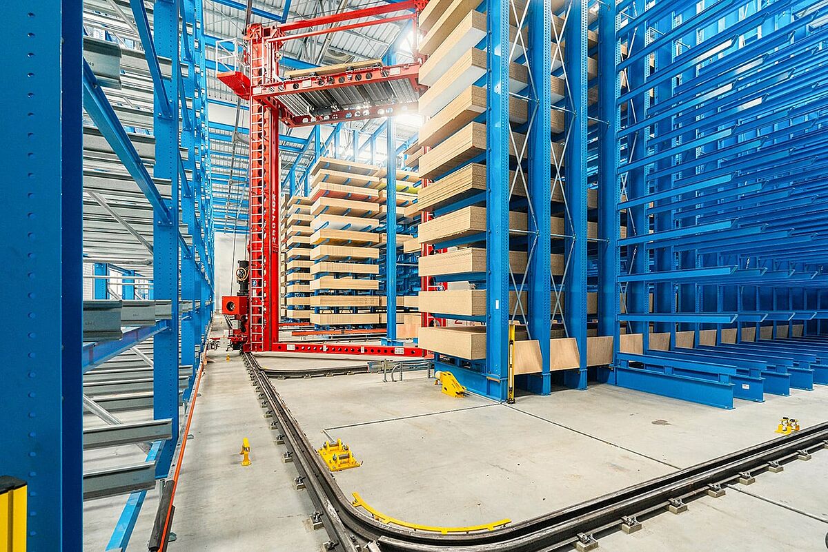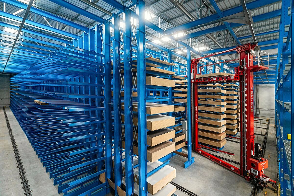 OHRA leverde in totaal zeven dubbelzijdige en twee enkelzijdige, 57 meter lange draagarmstellingen. De acht gangen worden door twee orderpickmachines bediend. De gangen tussen de stellingen worden door twee orderpickmachines bediend. Ze slaan de pakketten willekeurig op, ze vervoeren ze vervolgens naar een dwarsrek aan de voorkant van de gangen tussen de rekken. Een eveneens door OHRA gerealiseerde staalconstructie is rechtstreeks op dit dwarsrek aangesloten. Bovenop is een automatisch vacuümsysteem geïnstalleerd, dat de gevraagde individuele platen bevat voor maximaal vijf klantorders tegelijk. De volledig gepickte klantorders worden vervolgens door de orderpickmachine naar het overslagpunt getransporteerd, vanwaar ze uiteindelijk door een vorkheftruck worden verwijderd om te worden geladen.