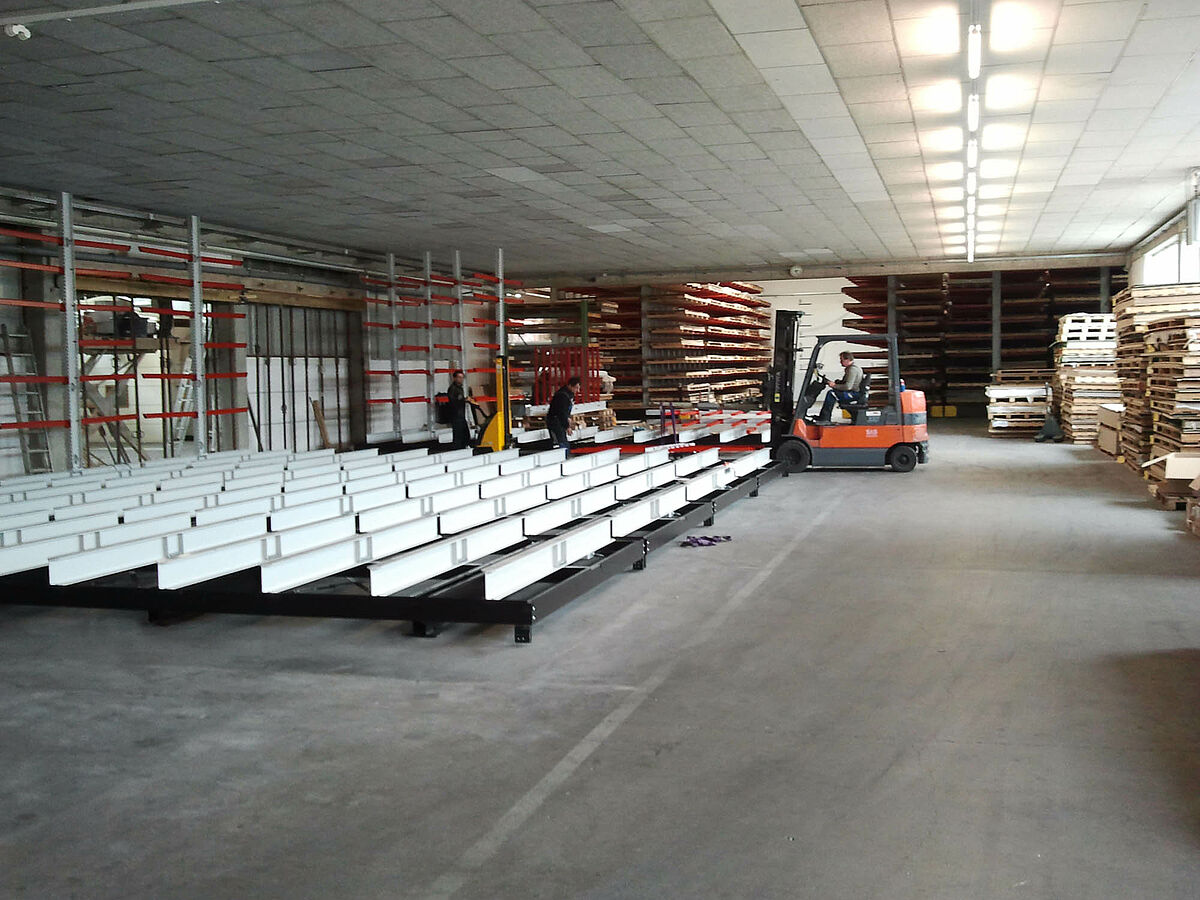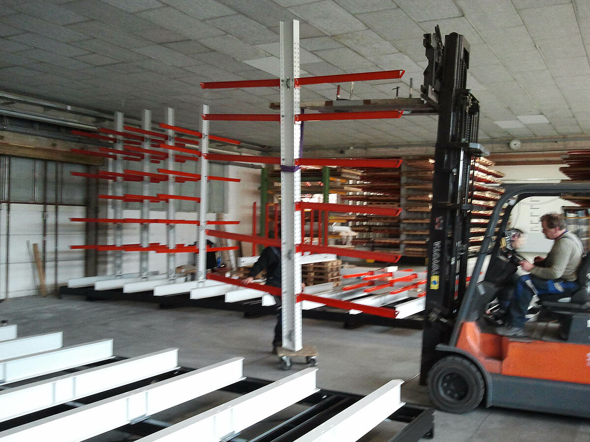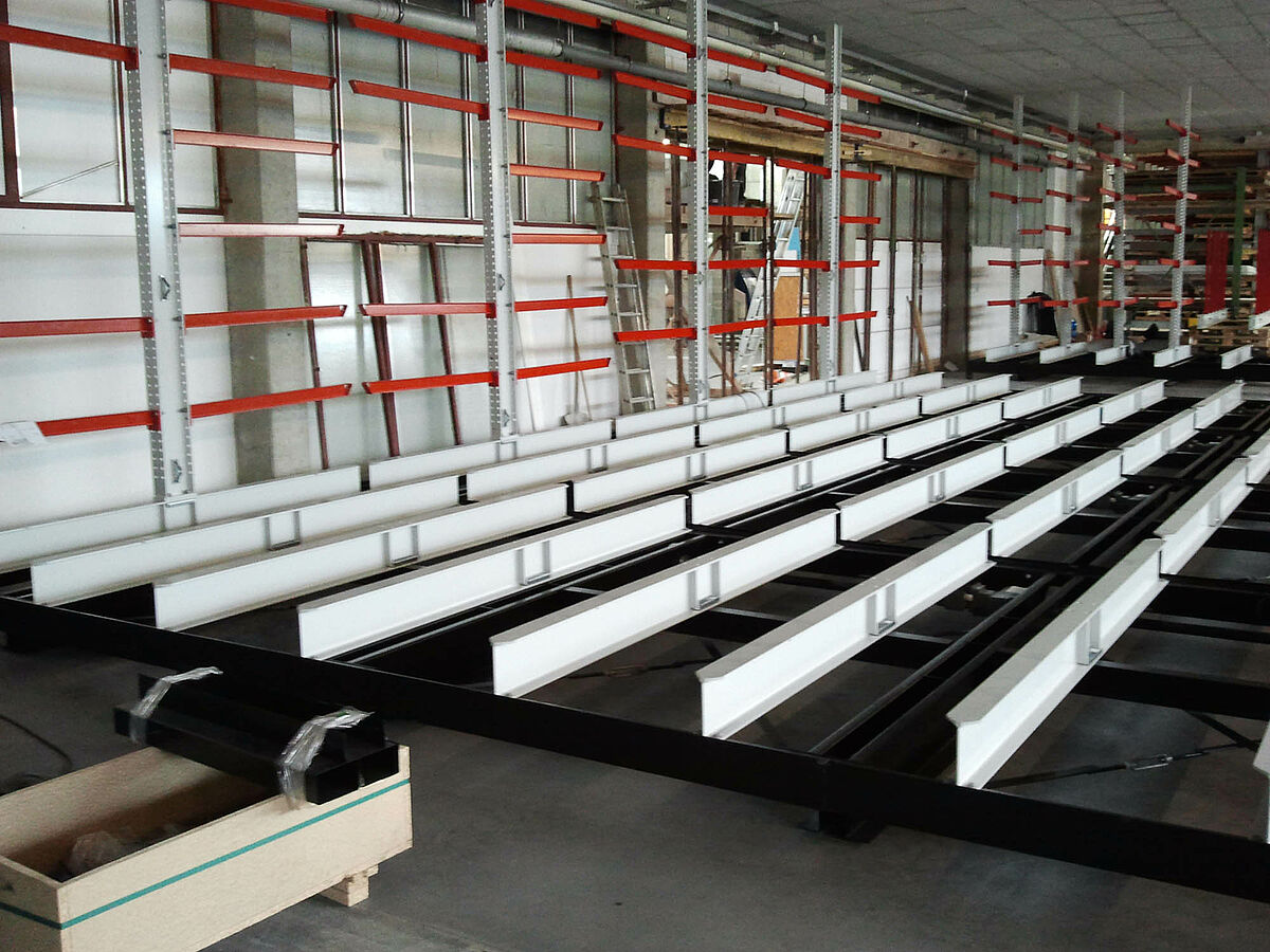 Die vond erform bij OHRA: de in Kerpen bij Keulen gevestigde specialist in draagarmstellingen biedt een systeem waarbij de stellingen op verrijdbare onderstellen worden gemonteerd. Deze verrijdbare stellingen maken bijna 100 procent meer opslagcapaciteit mogelijk dan normale, vast gemonteerde stellingen. De experts van OHRA monteerden bij erform een installatie met vijf 9 meter lange, tweezijdige draagarmstellingen. Binnen een hoogte van 4080 millimeter zijn zeven stellingniveaus gerealiseerd. Naast de op de verrijdbare onderstellen gemonteerde stellingen biedt een vaststaande, eenzijdige stelling nog meer opslagoppervlak.