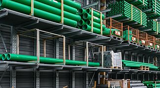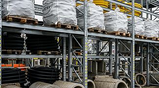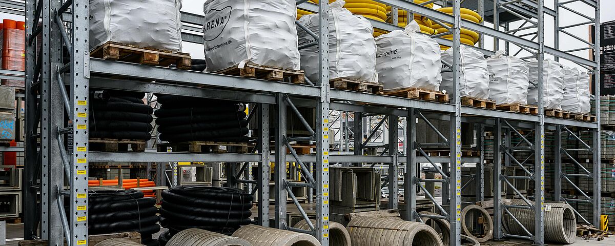 Vanwege de verschillende materialen voorzag OHRA de opslagruimtes zowel met draagarm- als met palletstellingen. In totaal werden 22 stellingen, enkel- en dubbelzijdig en met een hoogte van maximaal 7.500 millimeter geïnstalleerd. Elke stelling is individueel geconfigureerd voor de verschillende goederen op het gebied van draagvermogen, aantal opslagniveaus en accessoires. Terwijl de stellingen voor binnen in de gewenste kleur zijn geëpoxeerd, zijn de buitenstellingen gegalvaniseerd en dus beschermd tegen weersinvloeden. In sommige gevallen zijn de stellingen uitgerust met roosters om zo flexibel mogelijk te zijn bij de opslag van artikelen van verschillende afmetingen. Een bijzonderheid is ook de laatste enkelzijdige stellingrij van de hal: Deze is zo ontworpen dat het een damwand tussen de asmaten bevat – het vormt dus de achterwand van het gebouw.