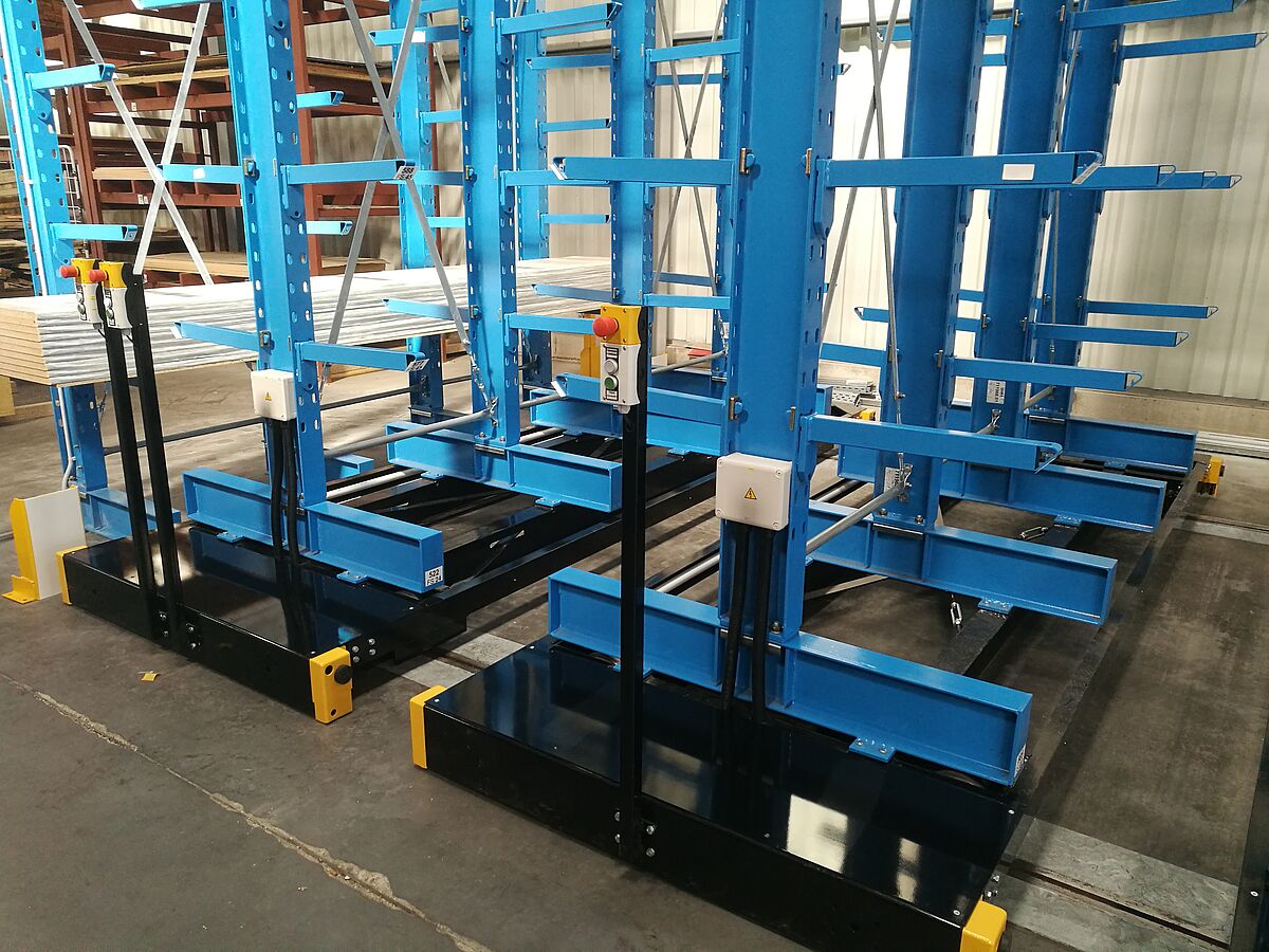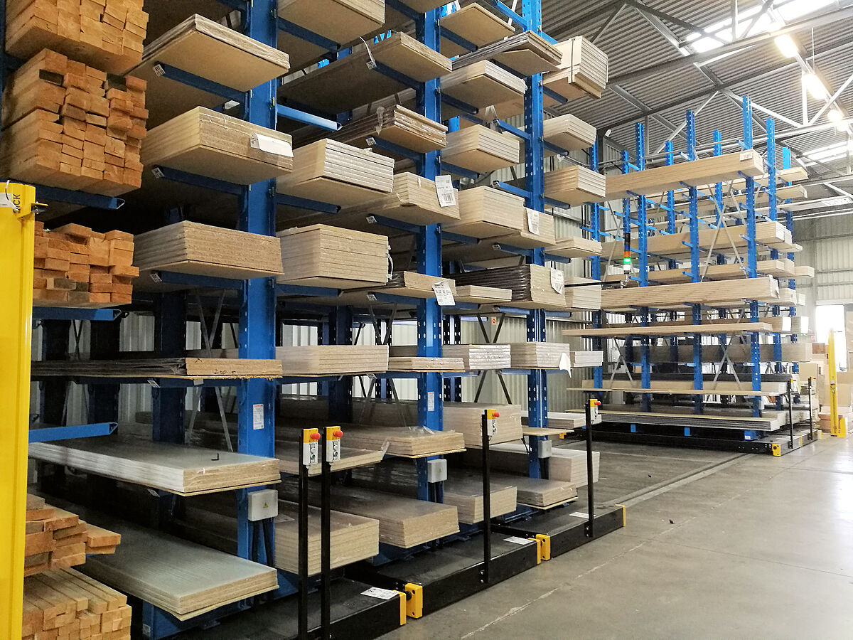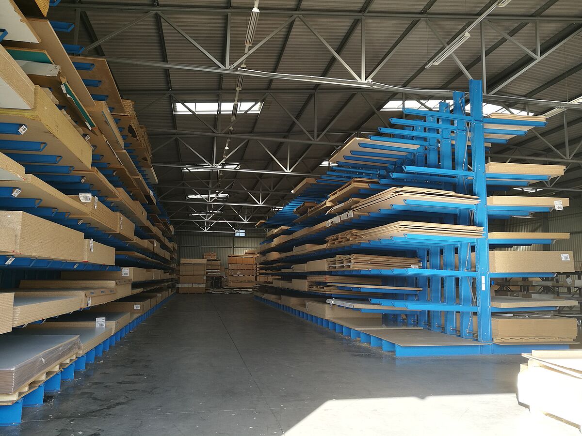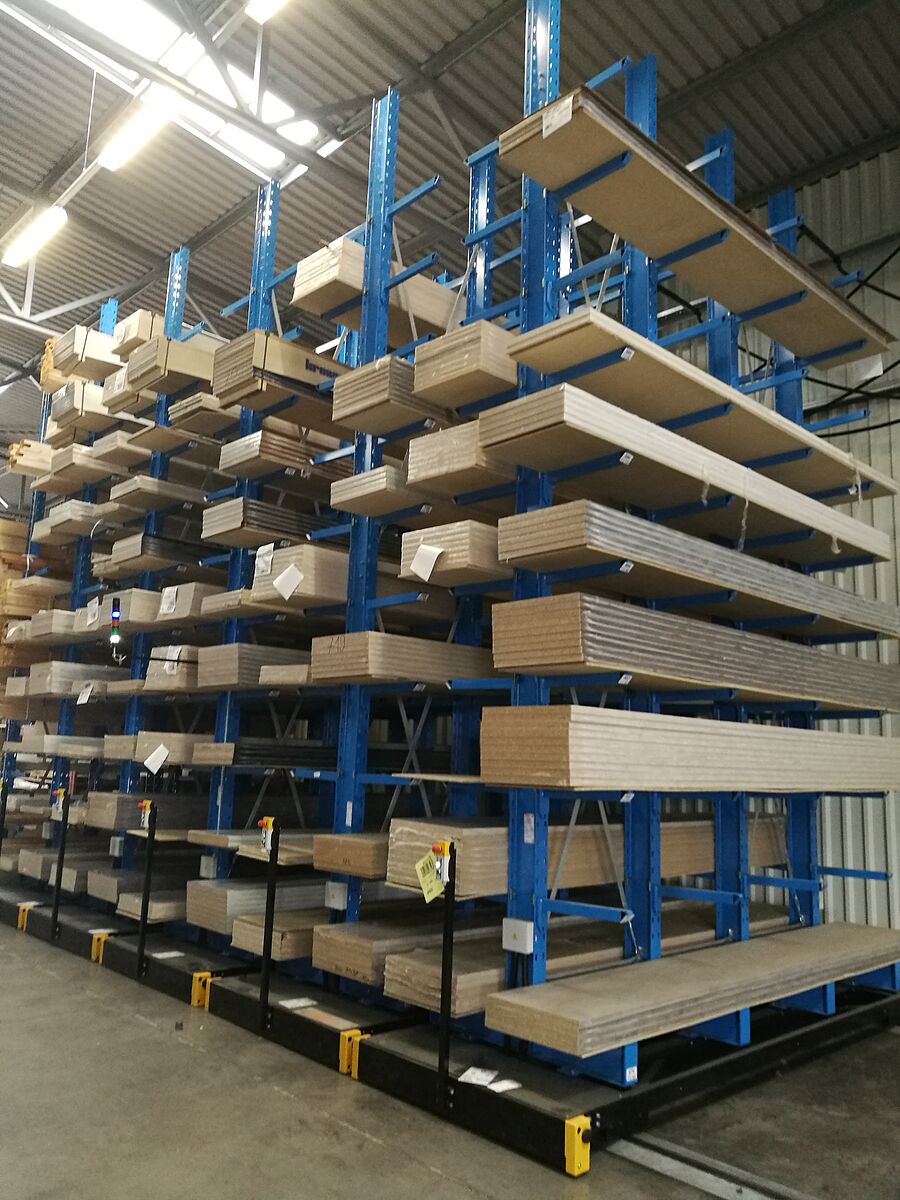 Het nieuwe magazijn voor keukenwerkbladen bestaat uit in totaal zeven stellingrijen. Elke rij is 6.600 millimeter hoog, 3.300 millimeter lang en bestaat uit vier standen, waaraan negen draagarmen flexibel zijn opgehangen. Dit resulteert in een totaal van tien opslagniveaus - het laagste niveau bevindt zich op de basis van de staanders. De buitenste lijnen zijn aan één zijde uitgevoerd en aan de vloer bevestigd, de resterende lijnen zijn gemonteerd op wagens die zich bewegen op rails die in de vloer zijn gelegd. De rekken worden op de wagens gemonteerd, die dicht bij elkaar staan. Als er goederen van een bepaald rek moeten worden gehaald, gaan de wagens uit elkaar en openen ze het gewenste gangpad. De besturing gebeurt vanaf de vorkheftruck door middel van afstandsbediening - een handmatige bediening is ook mogelijk. Met dit systeem kan optimaal gebruik worden gemaakt van de ruimte; in vergelijking met gewone ‘vaste’ rekken kan bijna 100 % meer opslagcapaciteit worden bereikt.