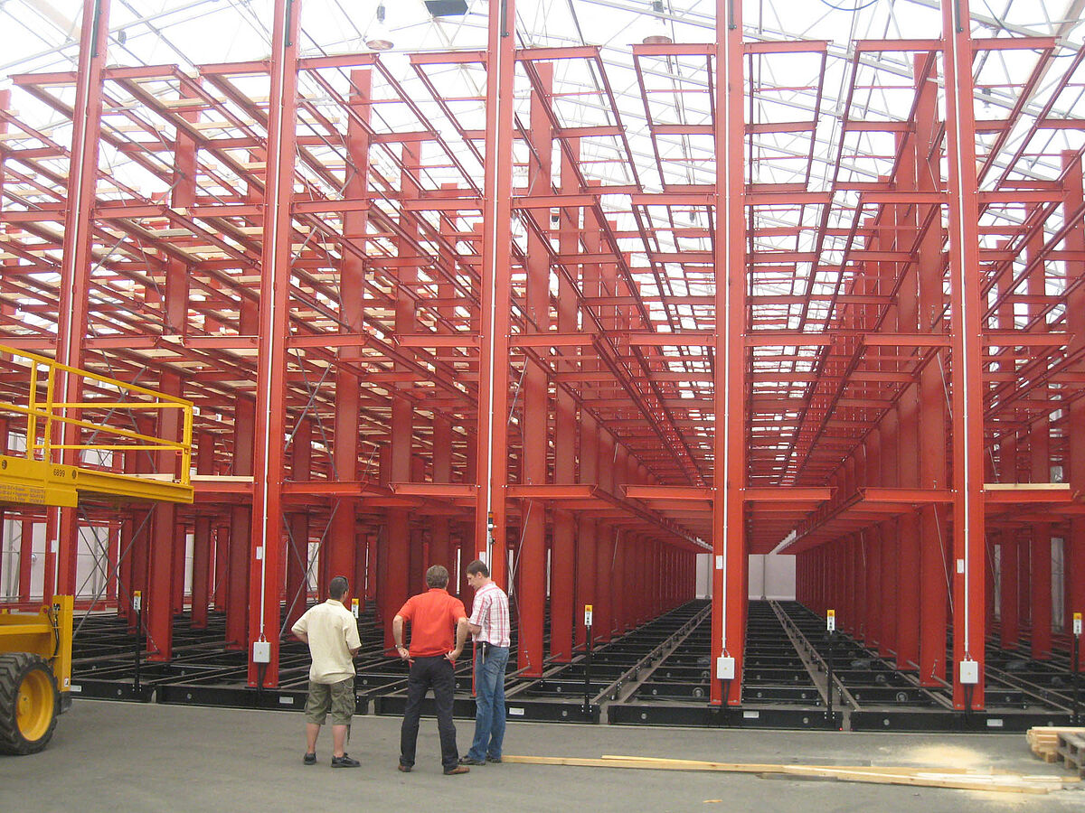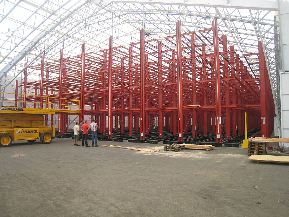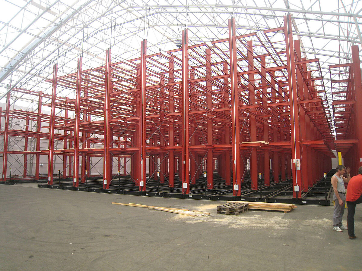 OHRA nam de montage van de hele stellinginstallatie op zich. Daarbij hoorde ook de montage van de benodigde verrijdrails, die nog voor de bouw van de eigenlijke hal in de open lucht plaatsvond. Van de in totaal tien 60 meter lange en met vier tot vijf niveaus tot 9,2 meter hoge draagarmstellingen werden er twee vast in de vloer verschroefd. De overige acht werden op 58 meter lange verrijdbare onderstellen van OHRA gemonteerd. De onderstellen worden elektrisch aangedreven en kunnen op afstand vanaf de vorkheftruck uit elkaar worden gereden. Alleen de gewenste gang opent zich; hierdoor wordt de opslagcapaciteit op het beschikbare oppervlak bijna verdubbeld.