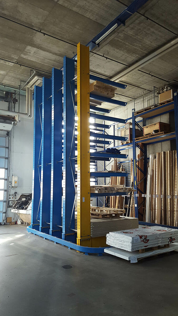 Omdat het magazijn plaats moest bieden aan zeer verschillende platen (massief houten platen, OSB-plaat, spaanplaat, triplex/multiplex, MFP-plaat en ook kwetsbare fineerplaat) was een multifunctioneel stellingsysteem noodzakelijk. Gfeller breidde daarom het aanwezige magazijn uit met draagarmstellingen van OHRA: het in Kerpen in Duitsland gevestigde bedrijf is Europees marktleider in draagarmstellingen. Alle dragende elementen van de stellingen zijn gemaakt van massief, warmgewalst staal. De stabiele constructie maakt grote opslaghoogten en een slanke bouwwijze mogelijk, zodat een hoger oppervlaktegebruik mogelijk is. Bij Gfeller zijn meer dan 7 meter hoge staanders gebruikt, waarmee opslag op negen niveaus kon worden gerealiseerd.