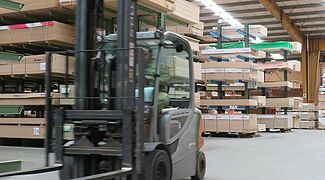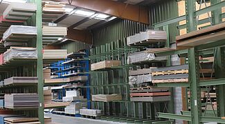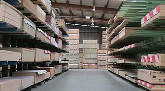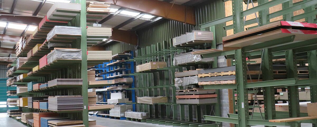 OHRA installeerde daarom verschillende stellingsystemen in de opslagruimte: Daartoe behoren draagarmstellingen, waarvan de 1.300 millimeter lange armen elk een draagvermogen van 750 kilogram hebben; het hoogste opslagniveau is 5 meter. Hier worden vooral platen opgeslagen die een hoge omloopsnelheid hebben en dienovereenkomstig snel moeten worden gepickt. Omdat in het HPL-platengebied een groot aantal verschillende artikelen moest worden ondergebracht, die worden opgeslagen op speciale pallets van 3050 x 1.300 millimeter, is hier een palletstelling gebruikt: Met een lengte van ongeveer tien meter en een hoogte van ongeveer 6 meter heeft het 15 opslagniveaus. Hierdoor ontstaat een groot aantal opslagniveaus, waardoor artikelspecifieke opslag per liggerpaar mogelijk is en de goederen dus snel toegankelijk zijn.