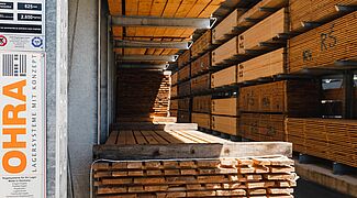 Marles besloot daarom het bestaande magazijn te vervangen door tien rijen draagarmstellingen van OHRA. De stellingen met een staanderhoogte van 6.080 millimeter maken het mogelijk om de houtpakketten op vier niveaus op te slaan en bieden dus aanzienlijk meer opslagcapaciteit op dezelfde oppervlakte. Bovendien is een directe toegang tot elk artikel mogelijk. Een geïntegreerd, 1,5 meter diep dak beschermt het opgeslagen hout tegen weersinvloeden, terwijl de stellingen zelf thermisch verzinkt zijn.