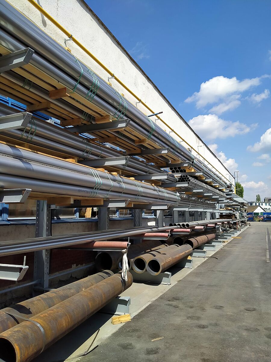 Het stellingensysteem van OHRA wist door zijn robuustheid en stabiliteit te overtuigen: aangezien OHRA alle dragende elementen van de stellingen uitsluitend uit volwandige stalen profielen vervaardigt, bieden deze een hoog draagvermogen met een slanke constructie. Daarnaast heeft OHRA de stellingen exact aangepast aan de wensen van Mebatex, zodat de verschillende buizen veilig en efficiënt kunnen worden opgeslagen. Daartoe plaatste OHRA op het buitenterrein twee rijen enkelzijdige draagarmstellingen met een totale lengte van ruim 92 meter.