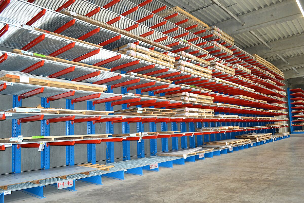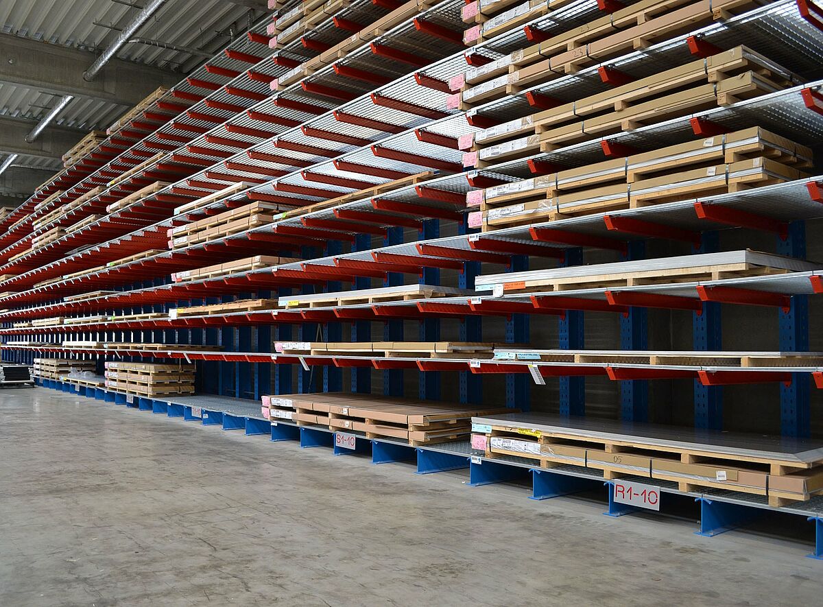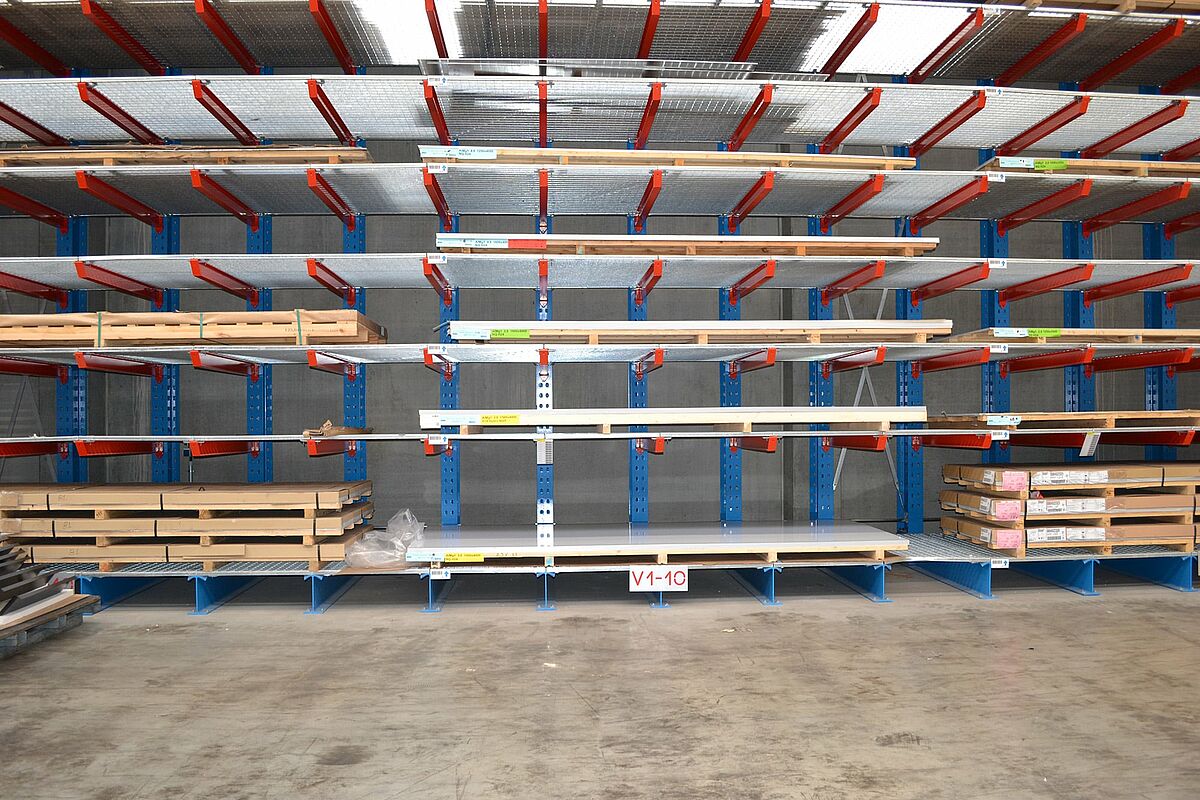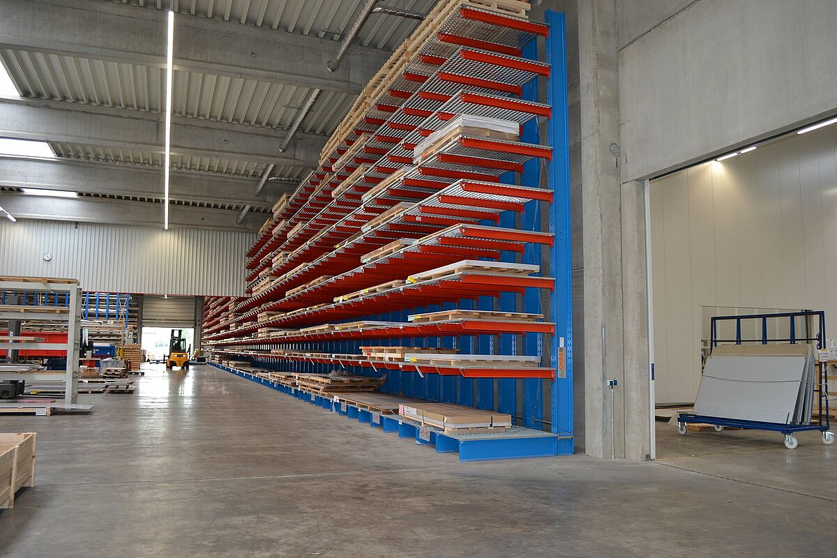 Er staan vandaag in totaal zeven tussen 3,6 en 76,5 meter lange, eenzijdige draagarmrekken in de moderne productiehal van Ronge Profil. Op een totaal van tien opslagniveaus - het hoogste op 6.800 millimeter hoog - bieden ze voldoende opslagcapaciteit om de productie flexibel te voorzien van de benodigde platen. Een dubbele bezetting is niet langer vereist - dit vermindert de inspanning en kosten voor in- en uitslag.