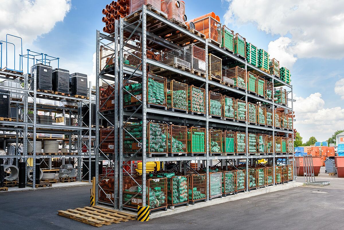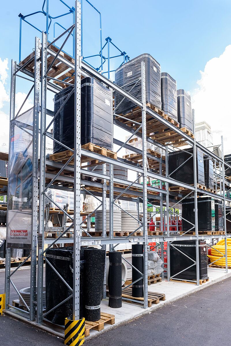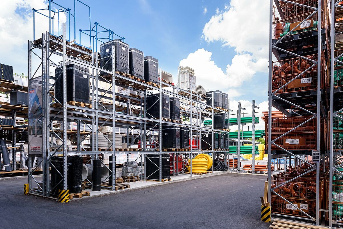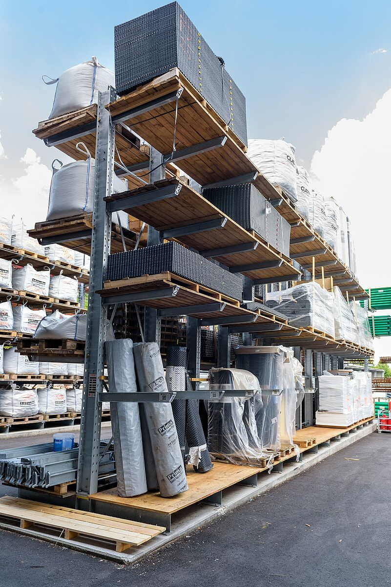 Het bedrijf koos voor een combinatie van draagarm- en palletstellingen: Dit maakt het mogelijk om een breed scala aan artikelen flexibel op te slaan. De stellingen zijn exact aangepast aan de eisen van het assortiment. In de draagarmstellingen van 7.510 mm op vijf opslagniveaus kunnen bijvoorbeeld drie pallets met isolatiemateriaal op elkaar worden gestapeld. Dankzij de veldbelasting van 4.500 kilogram kunnen zware goederen gemakkelijk worden opgeslagen in palletstellingen op europallets.