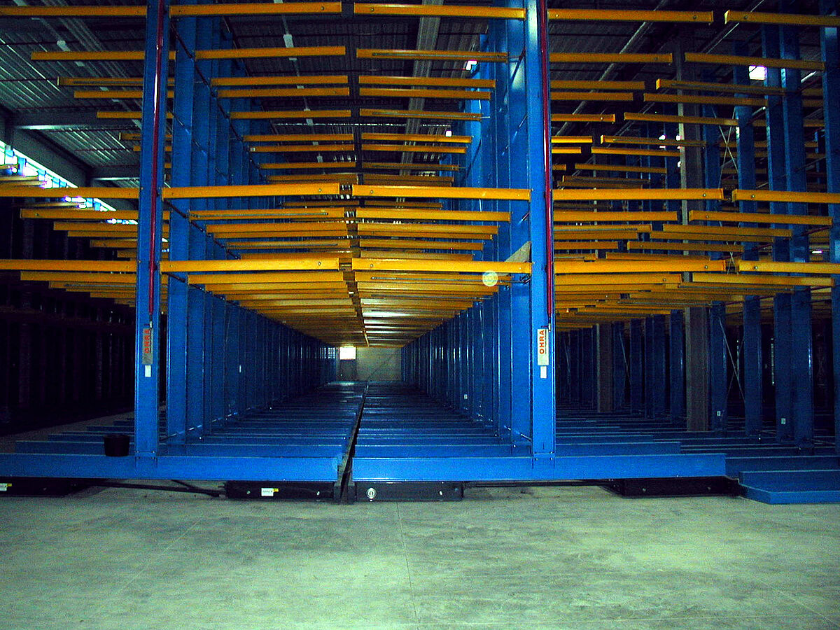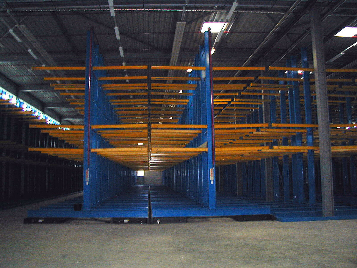Omwille van het grote volume zijn de coulissen bijzonder moeilijk op te slaan, en toch moeten ze snel gehanteerd kunnen worden en binnen handbereik zijn. Daarom heeft men gekozen voor een verrijdbare draagarmstelling . Op de draagarmen van 2.500 mm werden de grootste paletten (2,2 x 6 m) op 3 niveau’s en met een vakhoogte van 2.100 mm gestapeld. In het staatstheater werden 6 verrijdbare sokkels geproduceerd met op iedere sokkel een 60 meter lange dubbelzijdige draagarmstelling.