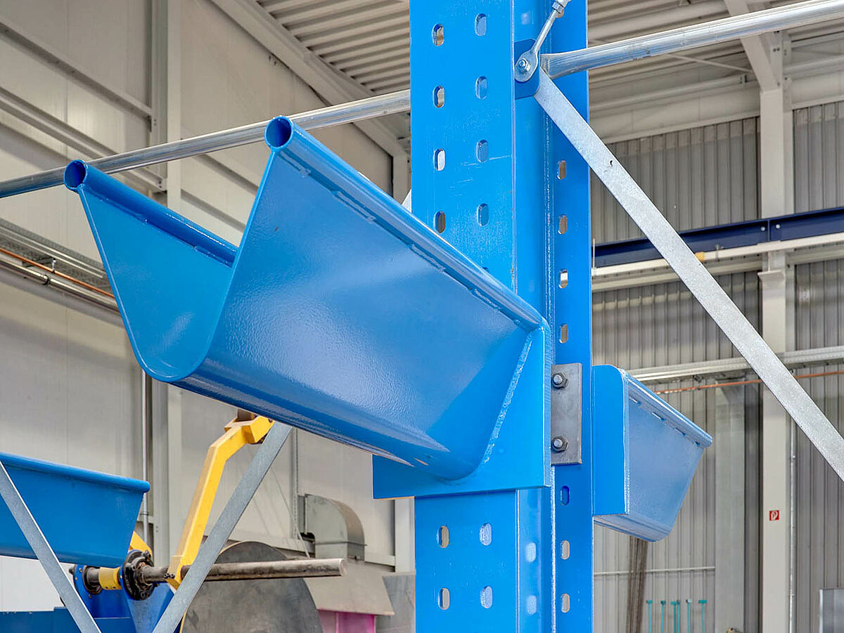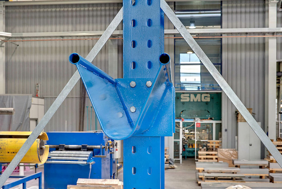 Voor de opslag van de coils heeft THERMOWAVE gekozen voor de robuuste coil-draagarmstellingen van OHRA. De door OHRA speciaal ontwikkelde coilarm heeft een draagvermogen van tot 15 t per arm en is zodoende speciaal geschikt voor de opslag van zware coils. Het in en uit de opslag plaatsen van de coils vindt plaats met een telescopische C-haak. Daarmee worden de coils rechtstreeks van de stelling naar de snij-installatie getransporteerd. Hier worden dan de gewenste platen op lengte gemaakt en aansluitend verder verwerkt, bijvoorbeeld op een pers voor het aanbrengen van ribbels.
