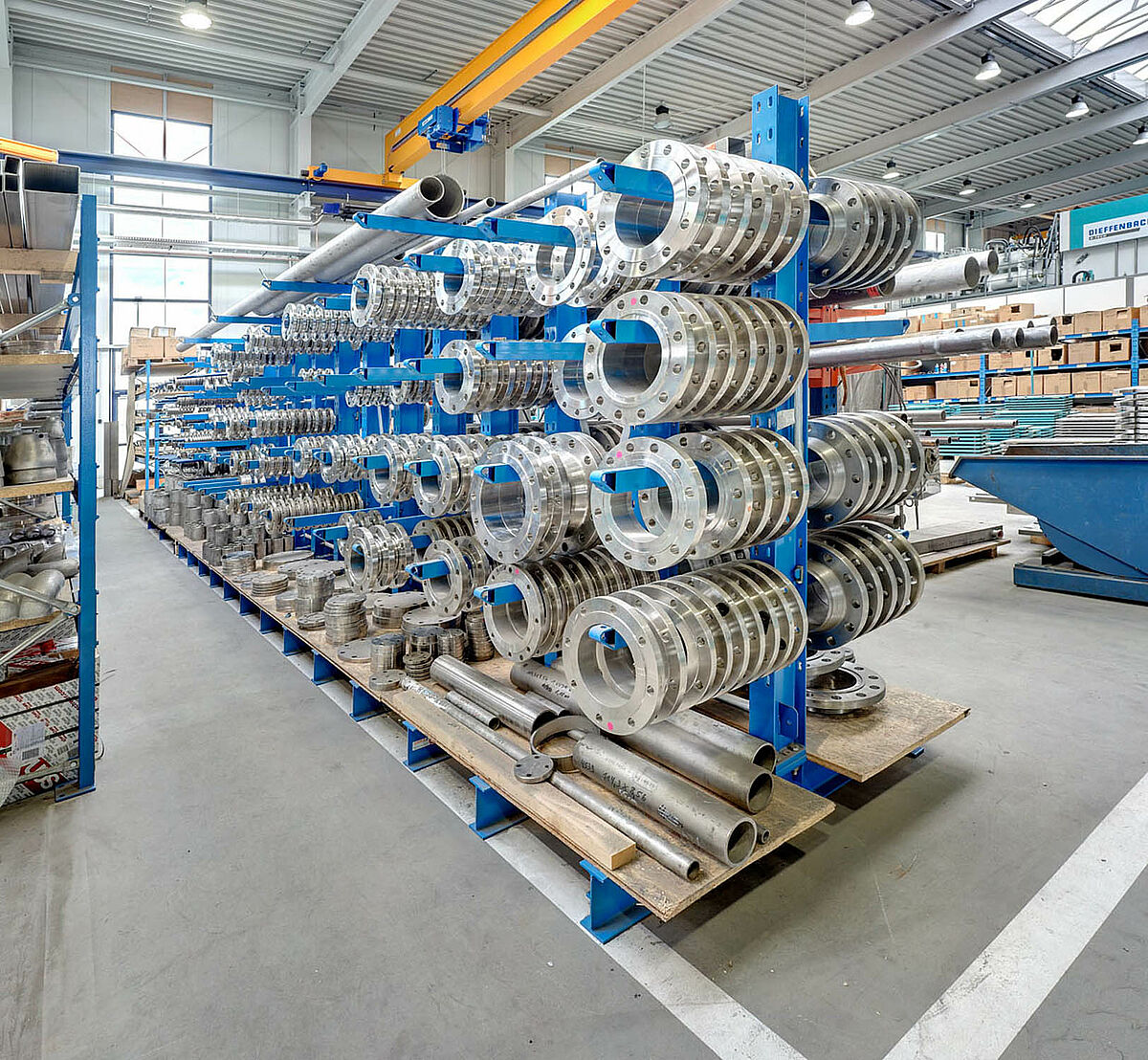 Naast het ruwe materiaal worden ook andere werkstukken zoals flensen in de robuuste draagarmstellingen opgeslagen. Deze flensen zijn nodig voor de aansluiting op de vervaardigde warmtewisselaar. Per platenwarmtewisselaar worden vier flensen gebruikt. Op deze manier is een evenredig groot aantal van deze werkstukken steeds op voorraad beschikbaar.