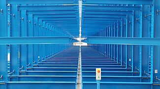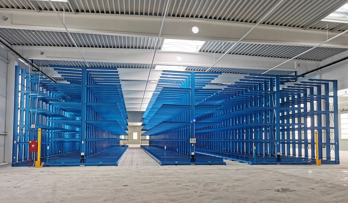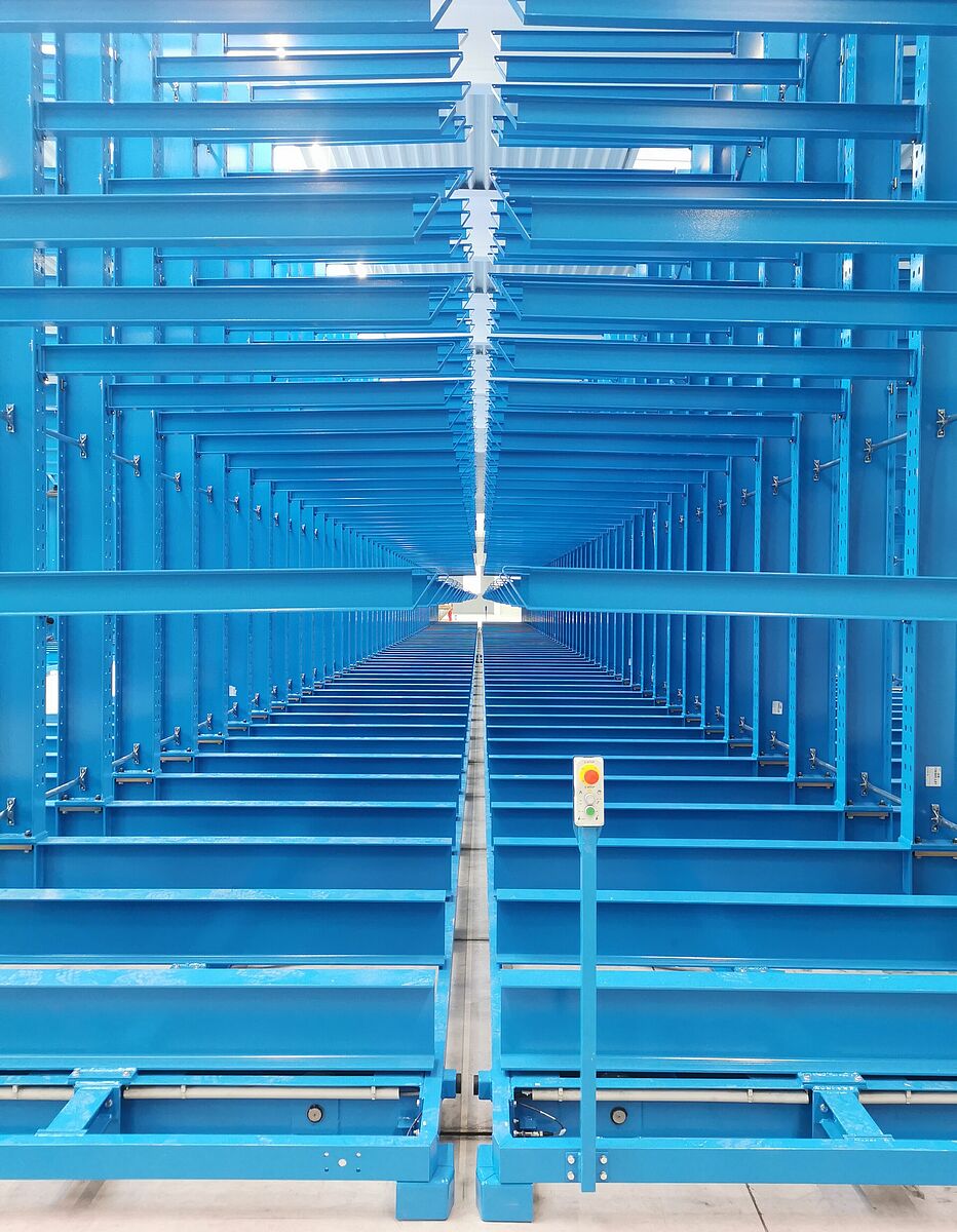 Het systeem bestaat uit drie enkelzijdige stationaire draagarmstellingen die stevig in de vloer zijn verankerd en drie dubbelzijdige draagarmstellingen die op verrijdbare wagens zijn gemonteerd. Door de wagens te verplaatsen tot een compact opslagblok, is er altijd maar één gangpad open voor gebruik met een vierwegheftruck: de benutting van de ruimte is dus optimaal. De verrijdbare stellingen zijn elk bijna 50 meter lang en 6,5 meter hoog. 2,1 meter lange draagarmen vormen vijf opslagniveaus en kunnen elk een lading tot 800 kilogram dragen. In totaal wordt elke wagen beladen met maximaal 528 ton. Ondanks deze belasting verplaatsen de wagens zich met een snelheid van ongeveer 4 meter per minuut - u hoeft dus niet lang te wachten tot de 4,59 meter brede gang opengaat.