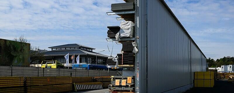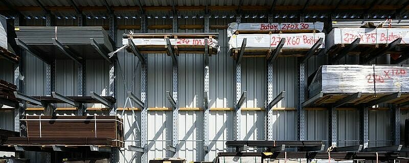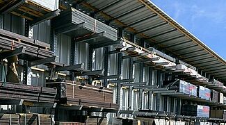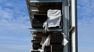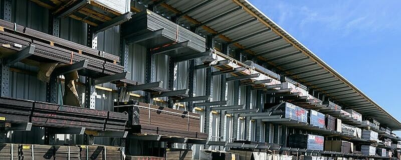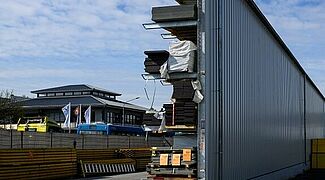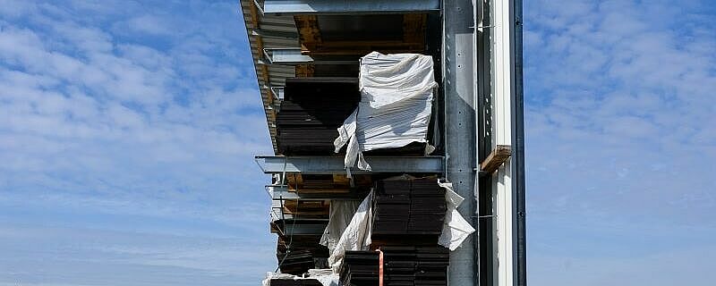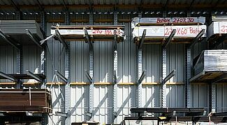Een geïntegreerd, twee meter diep dak en de met damwandbeplating beklede achterwand beschermen de opgeslagen multiplexplaten tegen weersinvloeden. Een uitdaging was dat de platen tussen 3,3 × 2,4 en 0,6 × 0,3 meter groot zijn. Om te voorkomen dat platen tijdens de opslag buigen, heeft OHRA de staanderafstanden aangepast en binnen de stelling gevarieerd: Tussen 26 staanders is het 1.000 millimeter, tussen de resterende 27 staanders 1.200 millimeter. Zo kunnen alle formaten veilig worden opgeslagen en kan de ruimte goed worden benut.