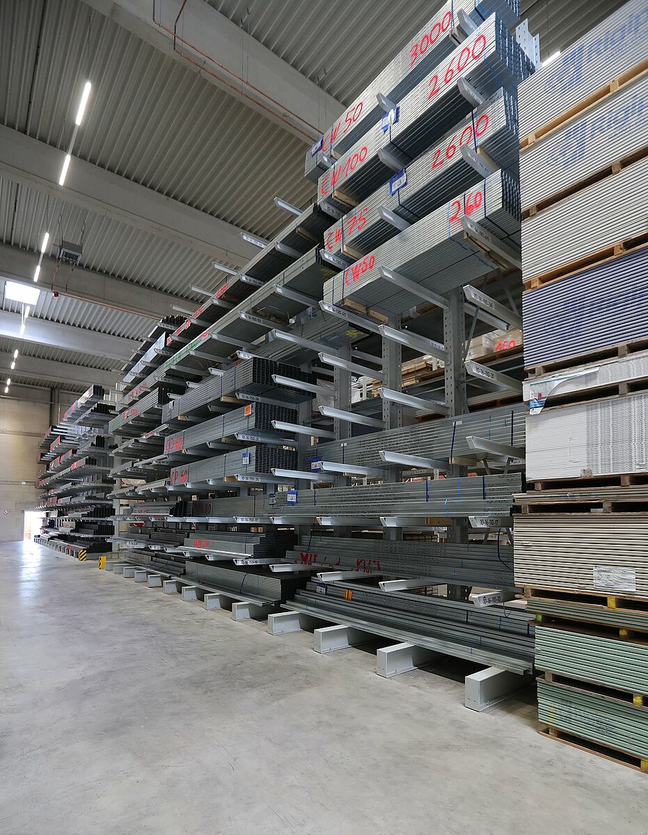 In totaal leverde OHRA meer dan 25 draagarm- en palletstellingen voor binnen en buiten. Elke stelling is individueel afgestemd op de plaats van installatie en de goederen die moeten worden opgeslagen. Zo zijn de liggerlengtes voor palletstellingen tussen 2.400 en 4.500 millimeter, voor liggerbelastingen van 3 tot 5,5 ton. Het draagvermogen van de OHRA-stellingsystemen zorgt voor een goede benutting van de halhoogte met zes opslagniveaus in de palletstellingen. Hetzelfde geldt voor de draagarmstellingen: ze hebben een draagvermogen tot 6.750 kilogram per staanderzijde. Afhankelijk van de goederen kunnen er zo tot negen opslagniveaus worden gerealiseerd. De vrijhangende armen met een draagvermogen van 750 kilogram maken een gemakkelijke aanpassing aan een veranderend goederenassortiment mogelijk.