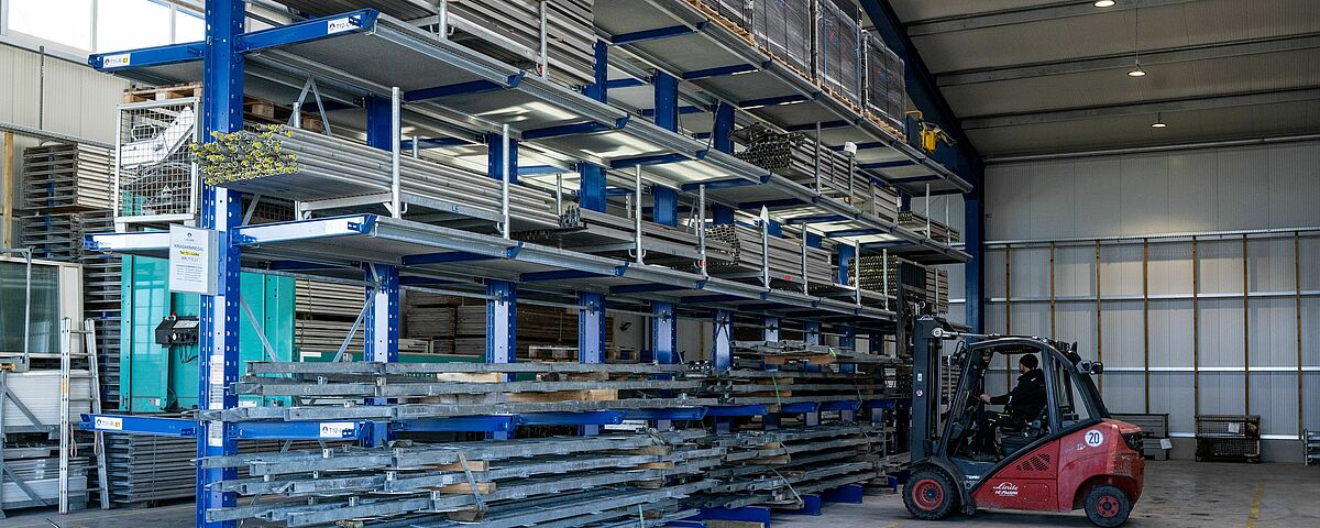 De inhomogene opgeslagen goederen vormden een uitdaging: Artikelen met verschillende gewichten, lengtes en hoogtes en in verschillende opslaghulpmiddelen (o.a. dozen, pallets, rekken met vier hoekpoten) moeten in de nieuwe rekken passen. "In de praktijk was het belangrijk voor ons om alle bestaande magazijngoederen in slechts één opslagsysteem op te slaan," zegt Fabian Bechtold, bedrijfsleider van LEUBE. Om dit mogelijk te maken, werden alle opslagniveaus van de draagarmstellingen voorzien van roosterbodems. Hierdoor kunnen artikelen stuk voor stuk flexibel en naadloos worden opgeborgen.